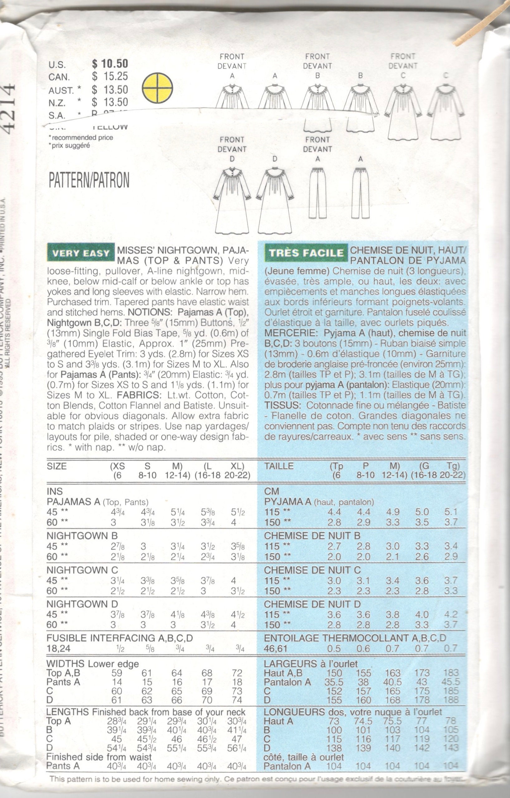 Butterick 4214 Misses Pajamas And Pullover Nightgown Pattern Etsy Osterreich